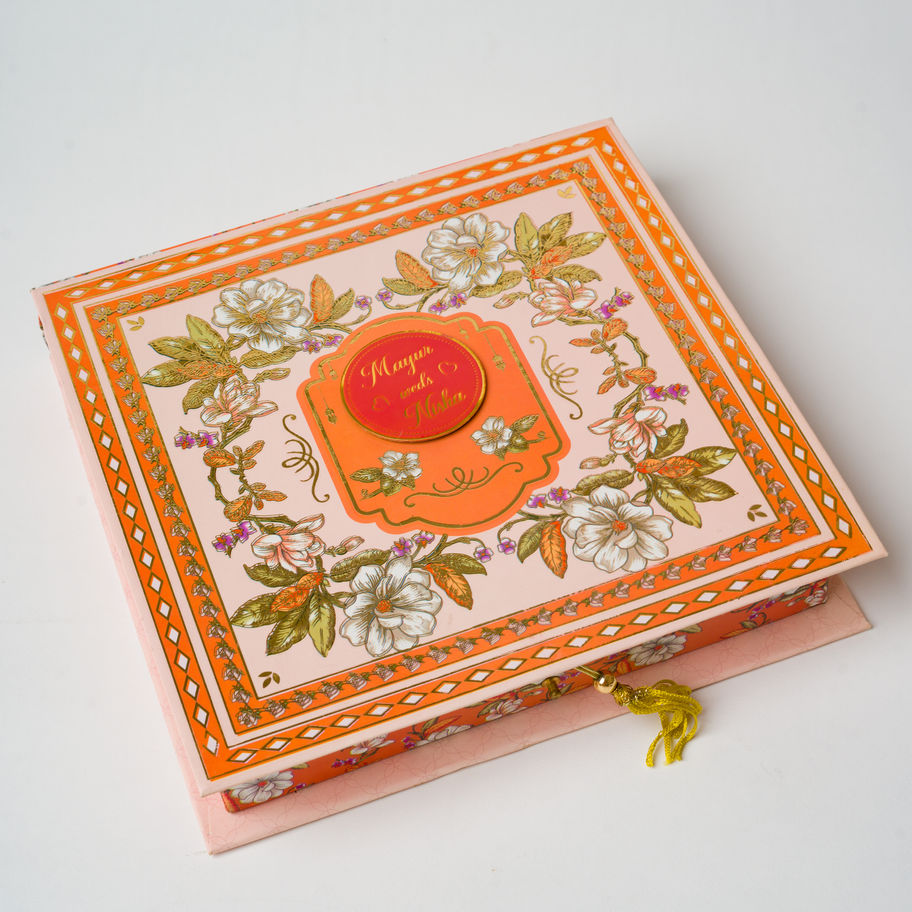 Orange Floral Box Wedding Card With Dry Fruit Trays