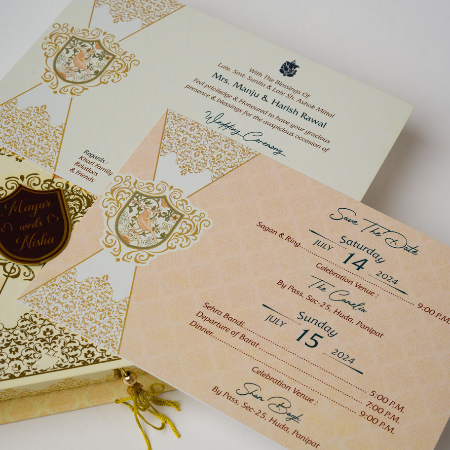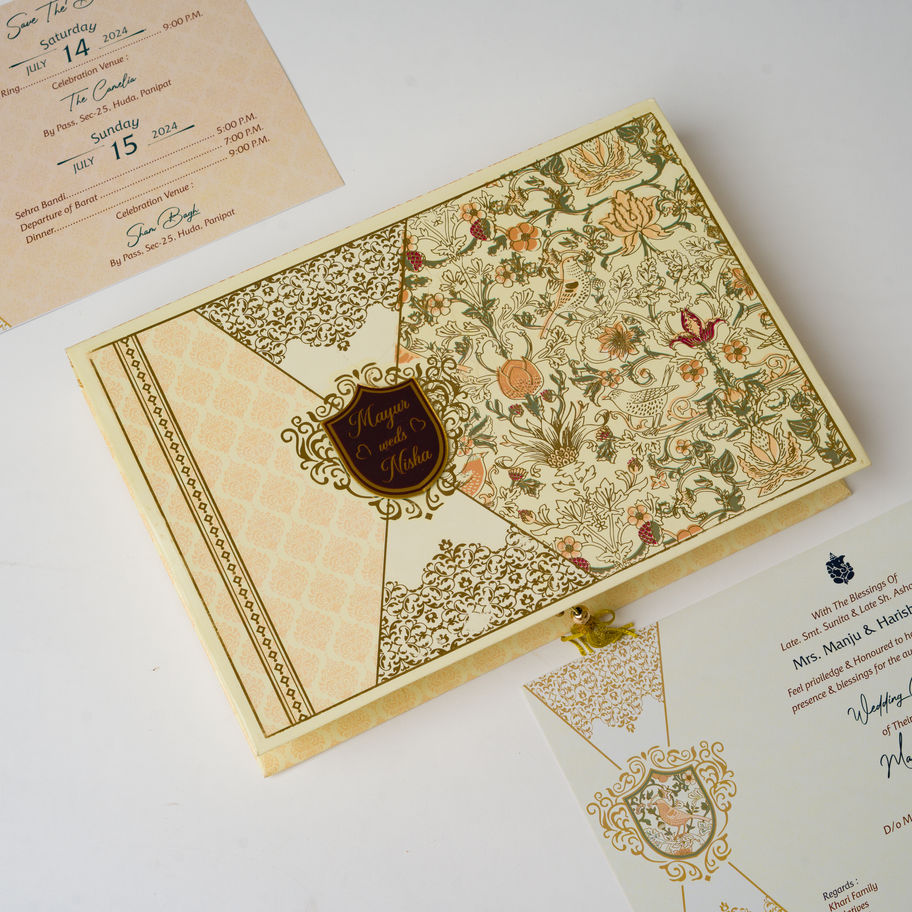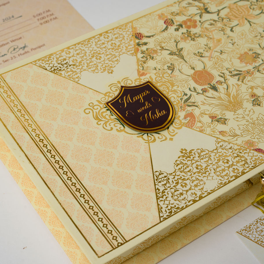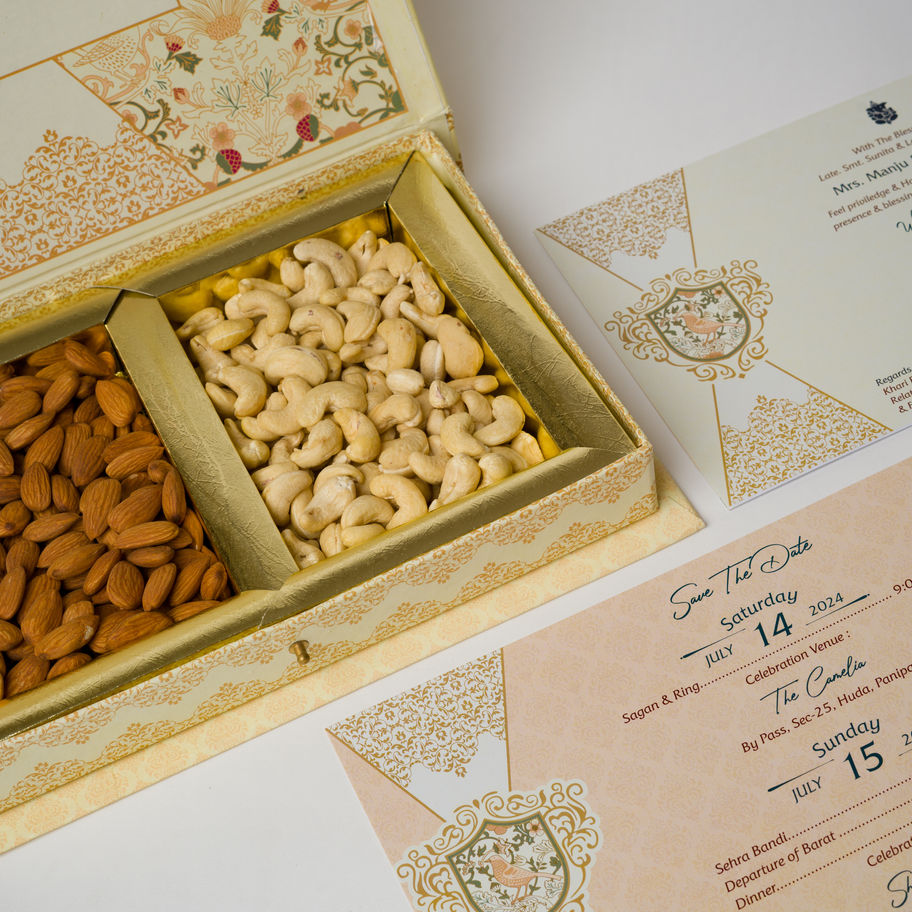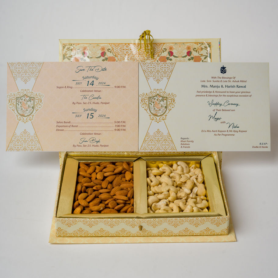 The Royal Beige Wedding Invitation Box exudes elegance and sophistication. Crafted in a soft beige hue, it features intricate detailing, such as delicate lace patterns or metallic accents, that add a touch of luxury. The box is designed to hold your wedding invitations securely while presenting them beautifully. Its refined aesthetic makes it a perfect keepsake for guests, capturing the essence of your special day. Ideal for couples seeking a classic and timeless presentation.