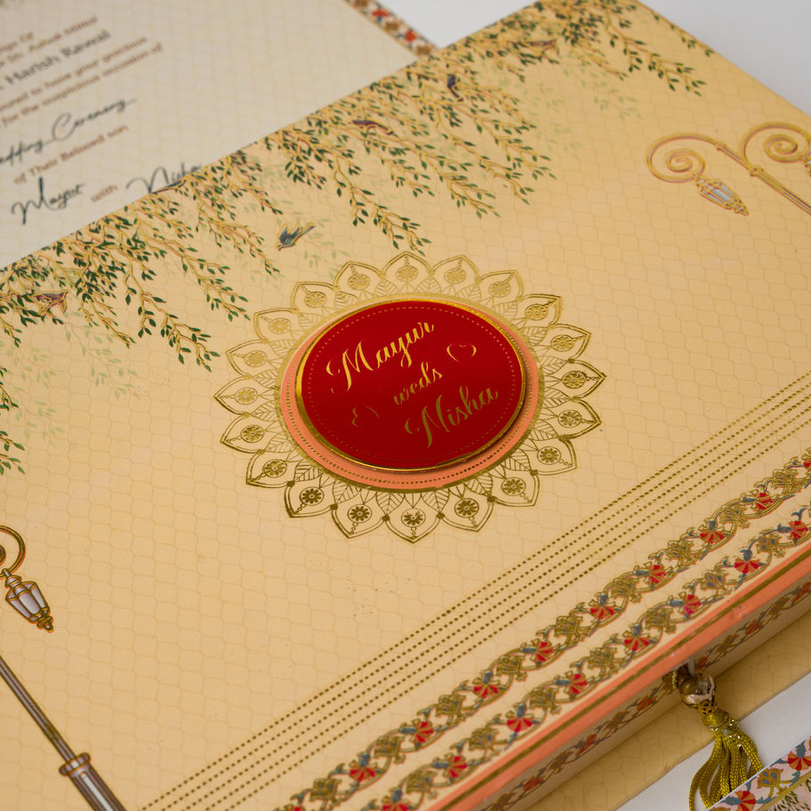 The Royal Cream Coloured Wedding Invitation Box offers a stunning blend of elegance and charm. Its creamy hue provides a warm, inviting feel, while subtle embellishments—such as gold or silver foil accents—add a touch of sophistication. Designed to cradle your wedding invitations beautifully, this box not only keeps them secure but also serves as a lovely keepsake for guests. Its timeless design makes it perfect for couples looking to create a memorable impression for their special day.