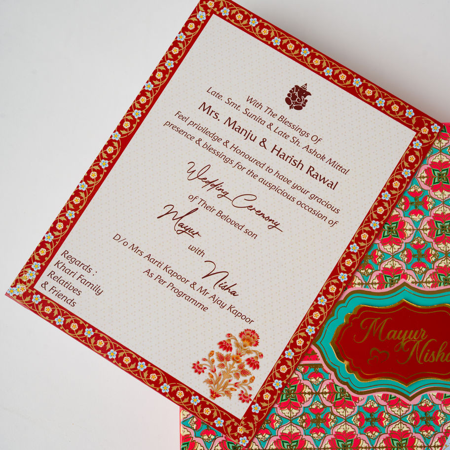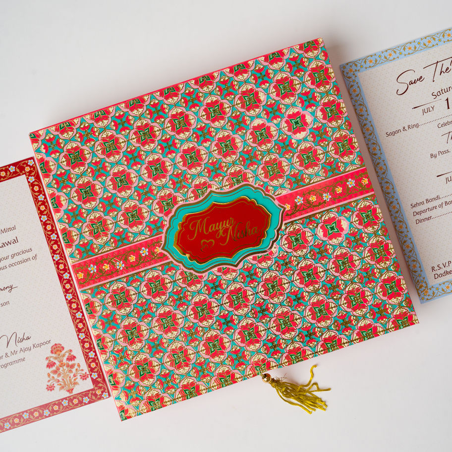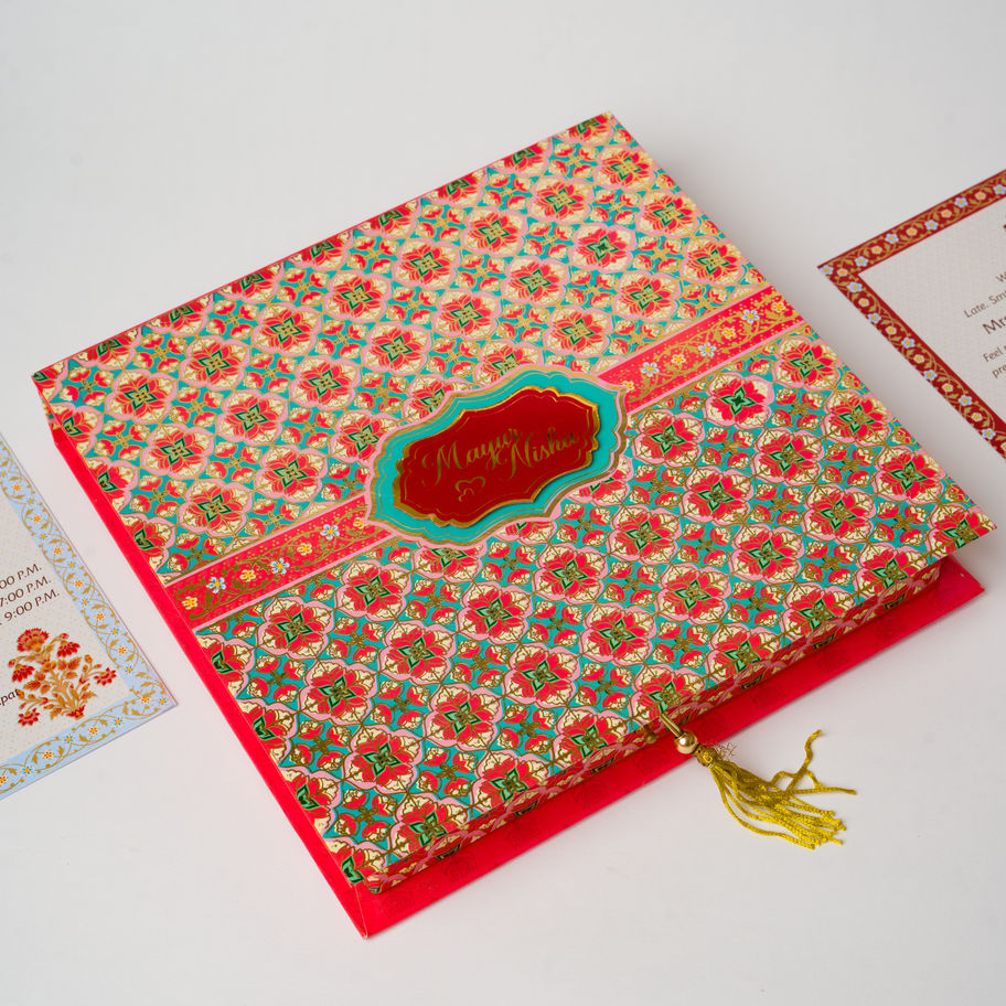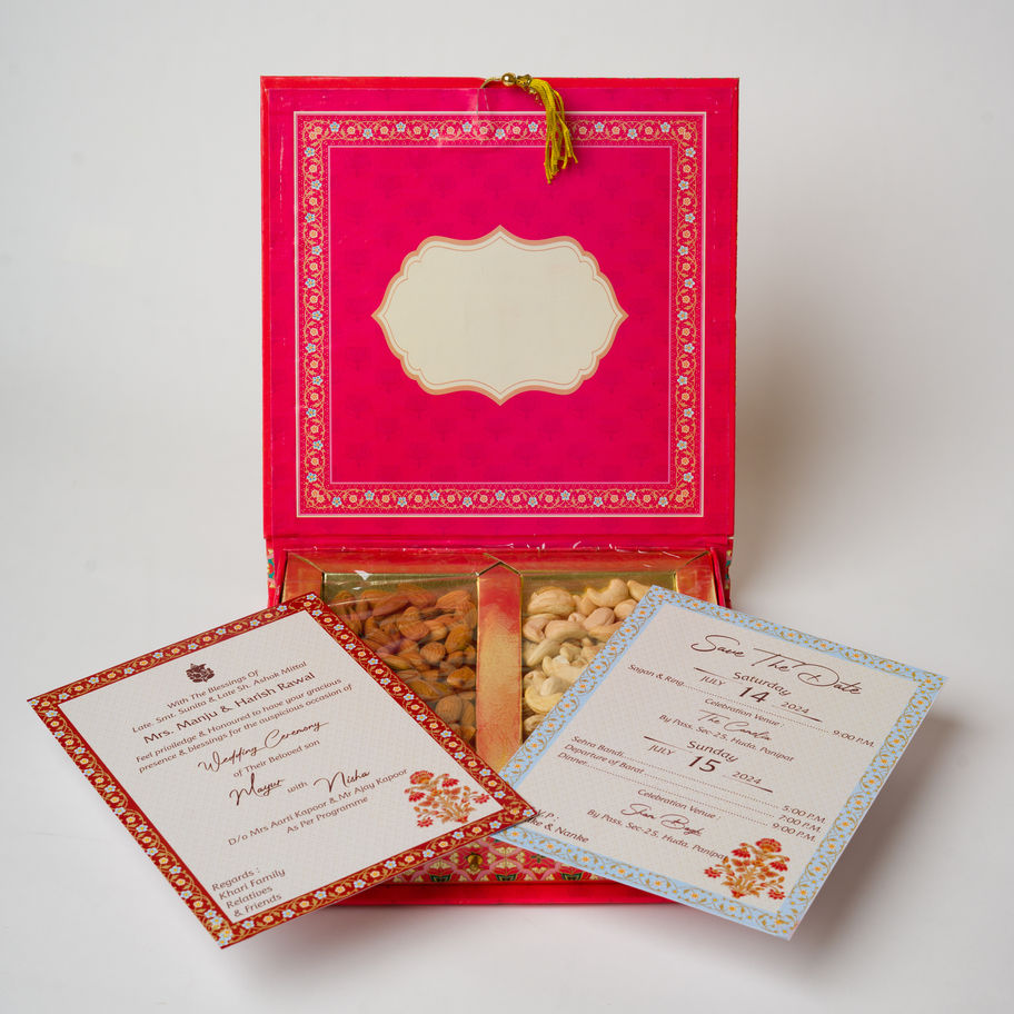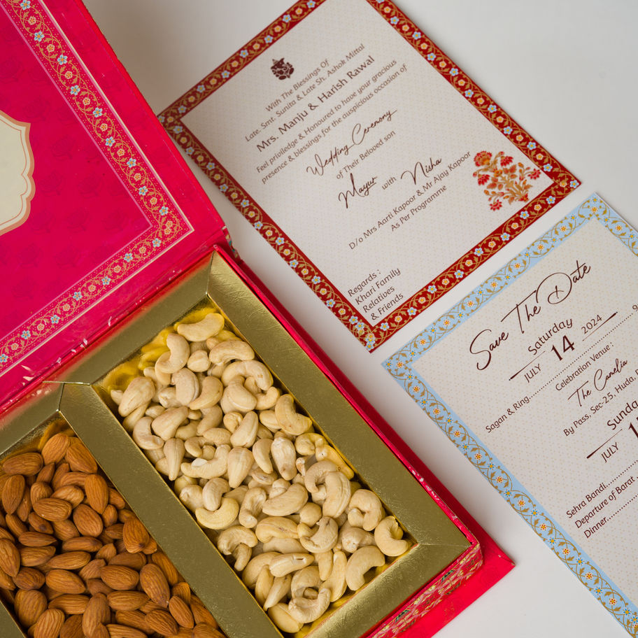 The Royal Red Box Wedding Card with Dry Fruit Trays is an exquisite wedding invitation set that exudes elegance and tradition. Crafted in a luxurious red box, it features intricate designs and vibrant embellishments. Inside, guests discover a beautifully printed invitation alongside thoughtfully arranged trays of premium dry fruits, adding a tasteful touch to the celebratory experience. This combination of artistry and indulgence makes it a perfect choice for announcing a grand wedding celebration.