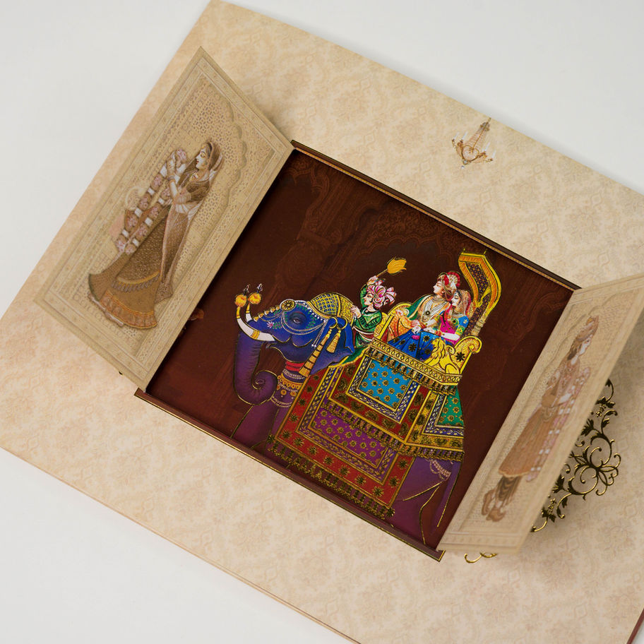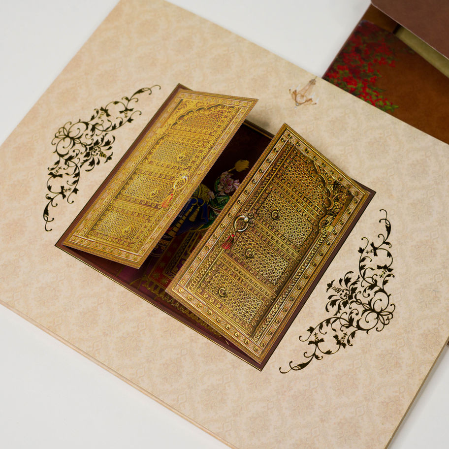 A royal wedding invitation card is crafted to convey opulence and grandeur, often using rich colors like gold, deep red, or navy with luxurious accents. It may feature elegant embossing, intricate filigree designs, and traditional motifs such as crowns or royal crests. The invitation often includes layered inserts or a box format with refined details, creating a sophisticated and memorable impression, setting the tone for an elegant and lavish celebration.